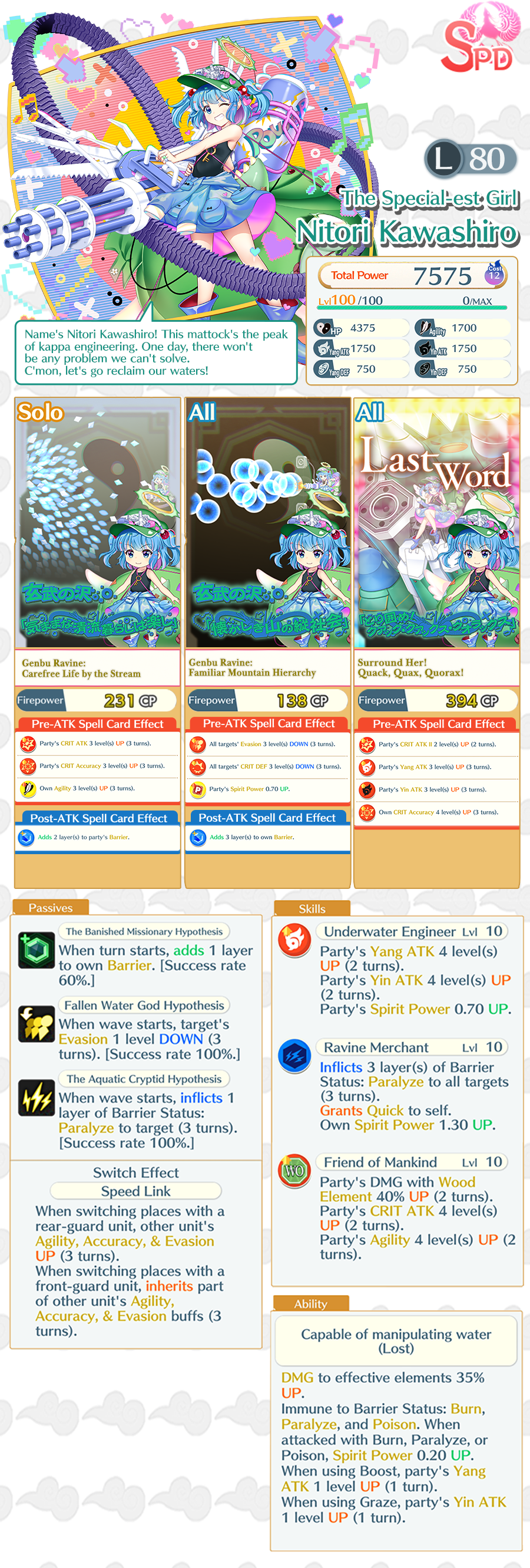 Venture into this all-new Story scenario to learn more about The Special-est Girl, Nitori Kawashiro (L80) via her special in-game scenario!