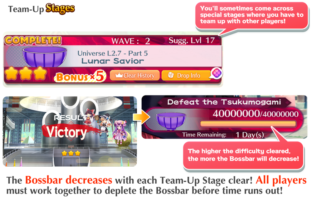 Note: Team-Up Stages will change each week. Defeating a featured enemy once lowers the Bossbar by 1 on Normal, 2 on Hard, and 5 on Lunatic.