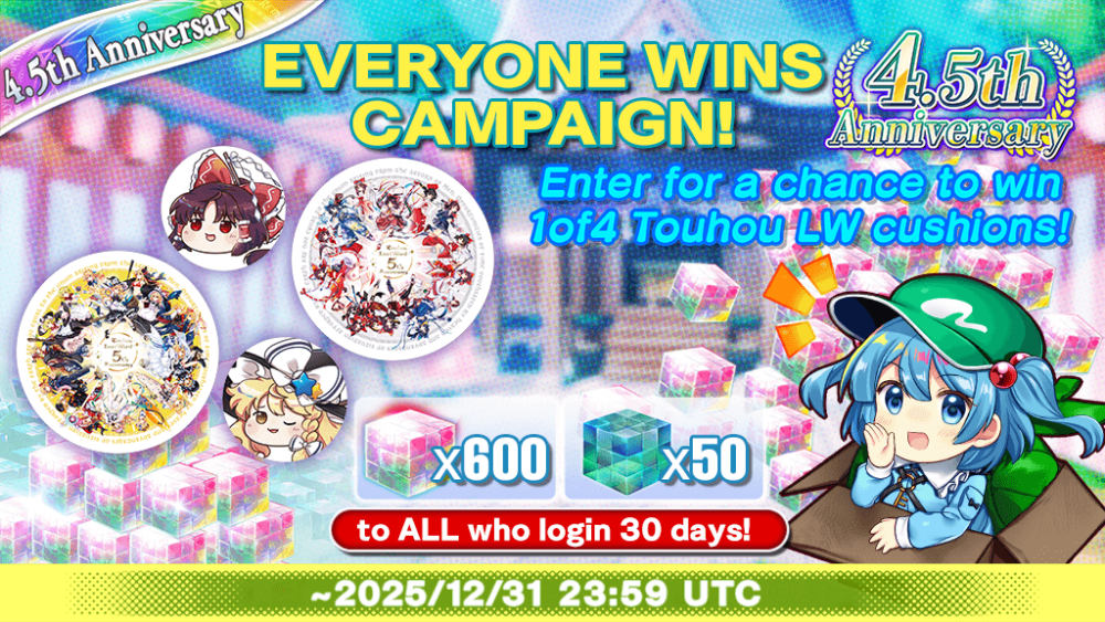 In celebration of Touhou LostWord’s 4.5th Anniversary, we’ll be holding an Everyone Wins Campaign, where everyone’s a winner!