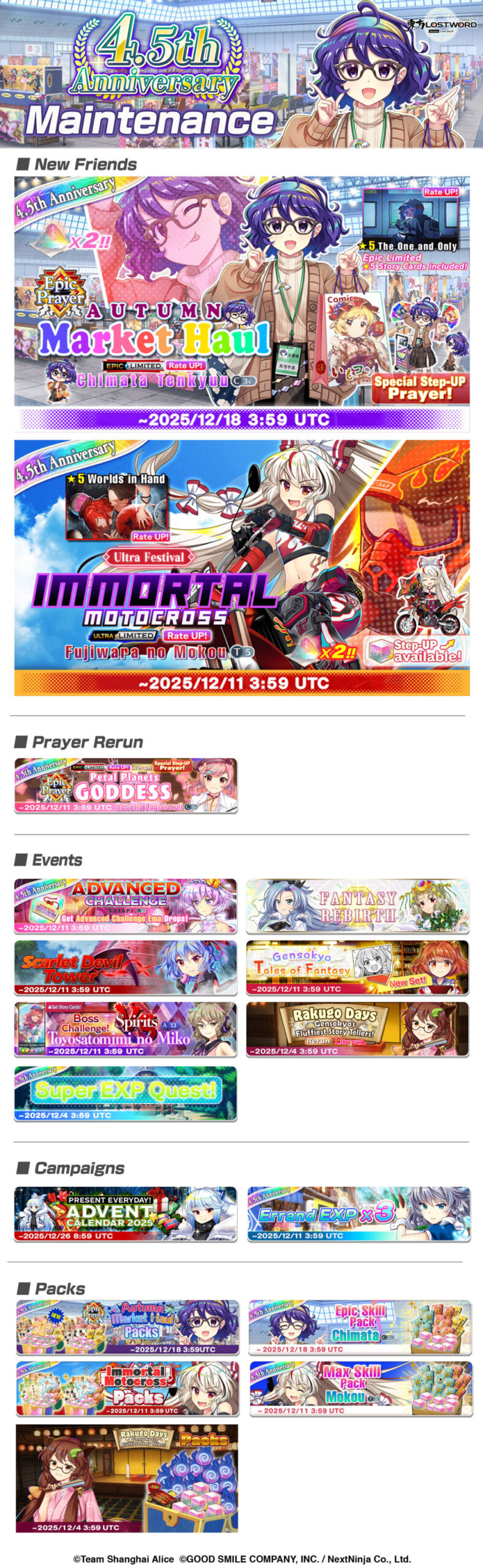 The game will be undergoing maintenance during the period listed below, during which you will not be able to play the game. We apologize for any inconvenience caused during maintenance.