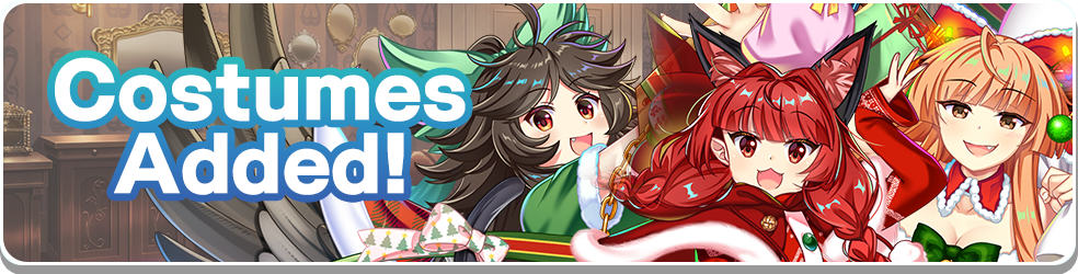 New costumes for Suika Ibuki (A7.5&), Rin Kaenbyou (L1) & Utsuho Reiuji (L1) to go with the A Solemn New Year event! They’ll be available in-game!