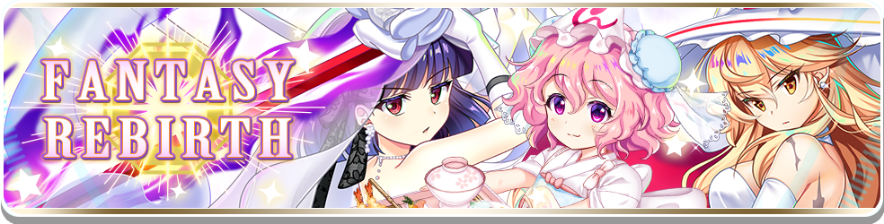 New Fantasy Rebirth costumes and stories for Marisa Kirisame (Z1), the Witch of Scarlet Dreams; Yuyuko Saigyouji (R2), the Tiny Ghost Mistress; and Youmu Konpaku (R8), the Mysterious Sword Master!