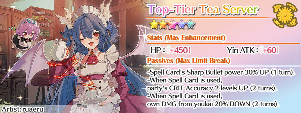 New costume for Remilia Scarlet (E1) to go with the Welcome to Teahouse Elysium event! It’ll be available in-game!