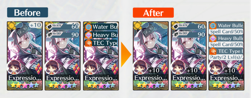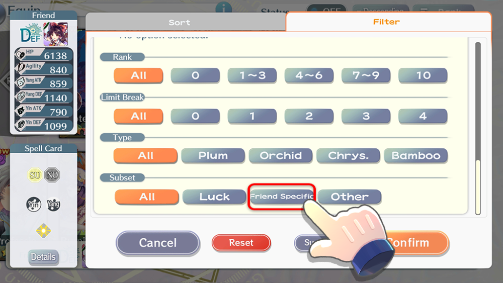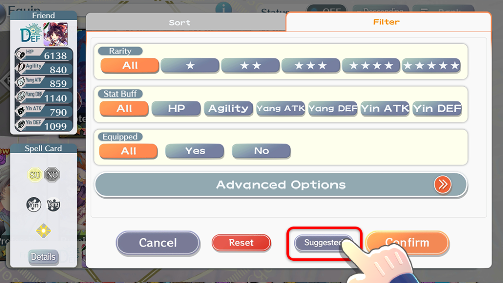 When you filter for a Story Card from a Friend’s Equip screen, you can now press the Suggested button to filter for Story Cards automatically. It will filter based on the Yin/Yang, Bullet type, and Element of the Spell Card’s first Bullet Line.
