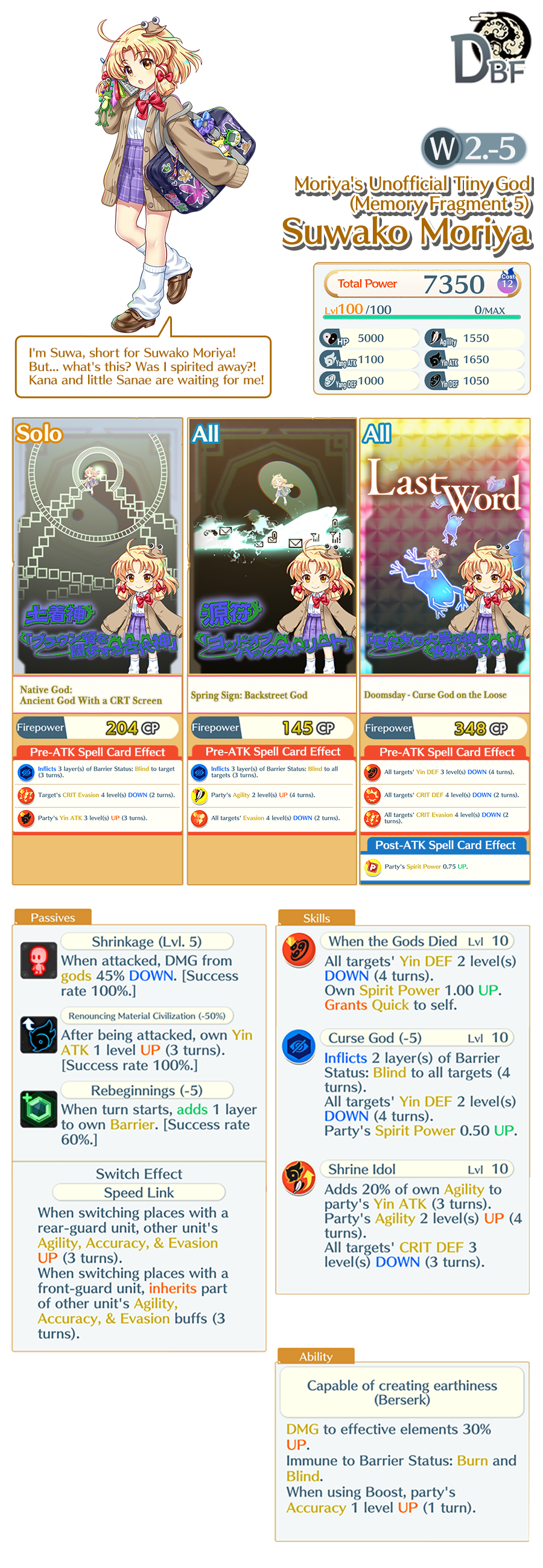 Note: Suwako Moriya (W2.-5) is only available this Aya Assistance season. She will not be included in subsequent seasons.