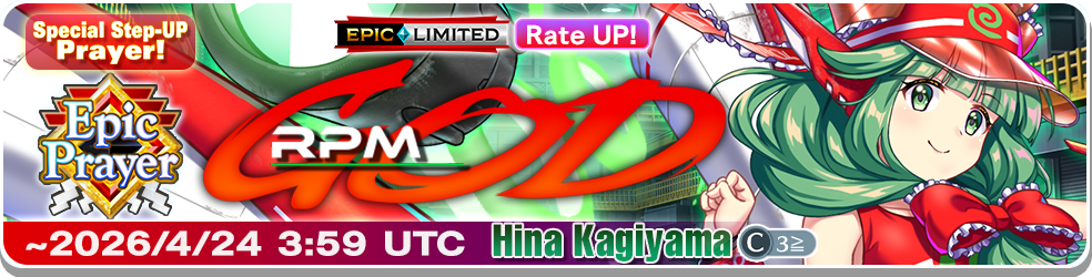 – After the Limited-time Epic Prayer: RPM God finishes, Hina Kagiyama (C3≧) will not be added to the Standard Prayer.